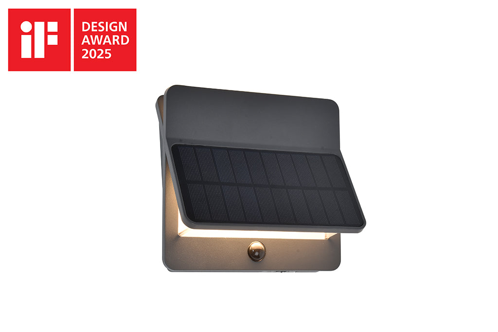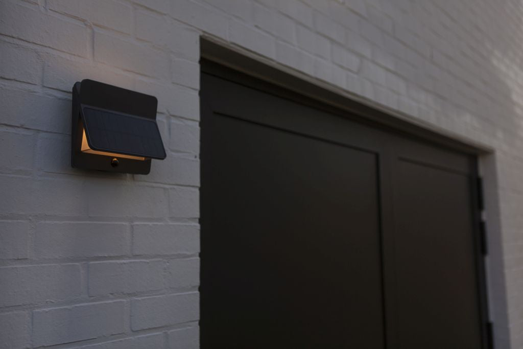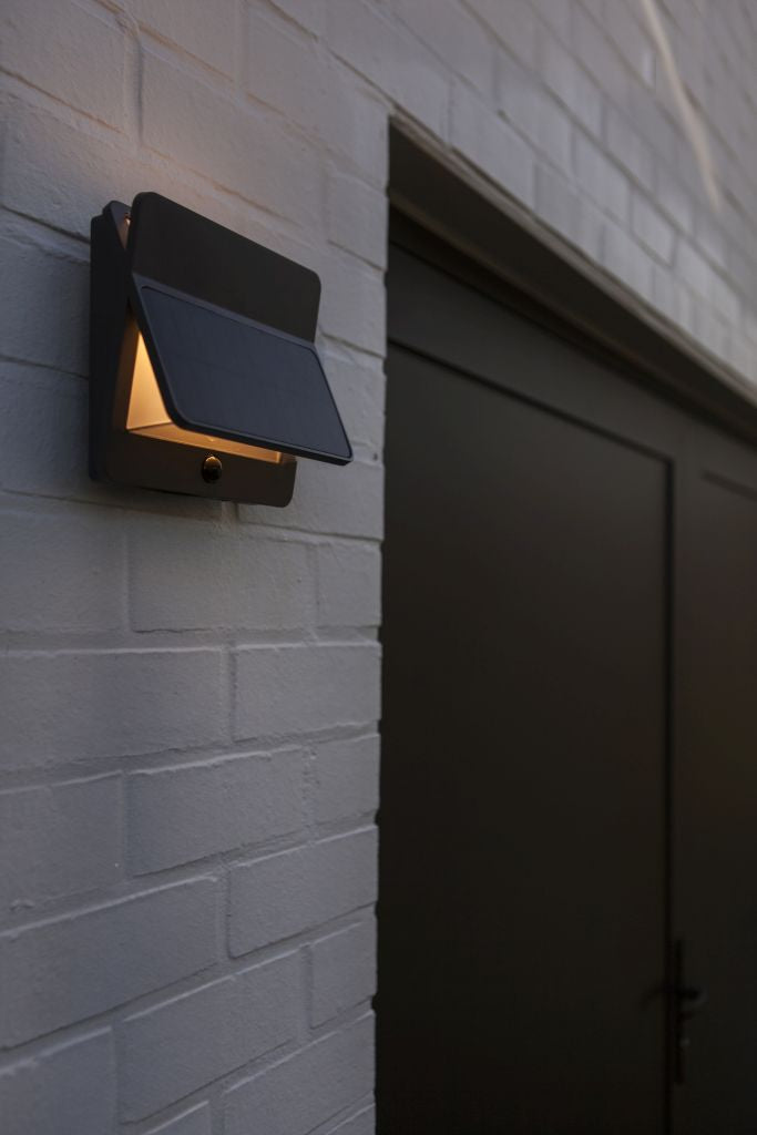 The ALETA solar LED wall light in dark grey features a frontal solar panel, PIR sensor, and provides both up and down lighting. This design efficiently harnesses solar energy, making it a smart and stylish choice for outdoor lighting.