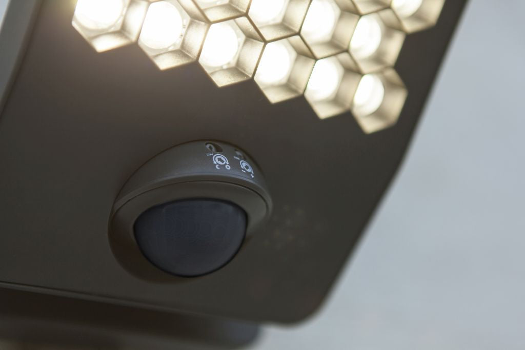 The ATLANTIS Outdoor LED security light features honeycomb clear diffusors and an adjustable head that can rotate 90° for targeted illumination. It includes an adjustable PIR sensor for added security. Available in both small and larger versions, this versatile fixture offers lighting options in either 4000K or 3000K, accommodating various outdoor lighting needs.