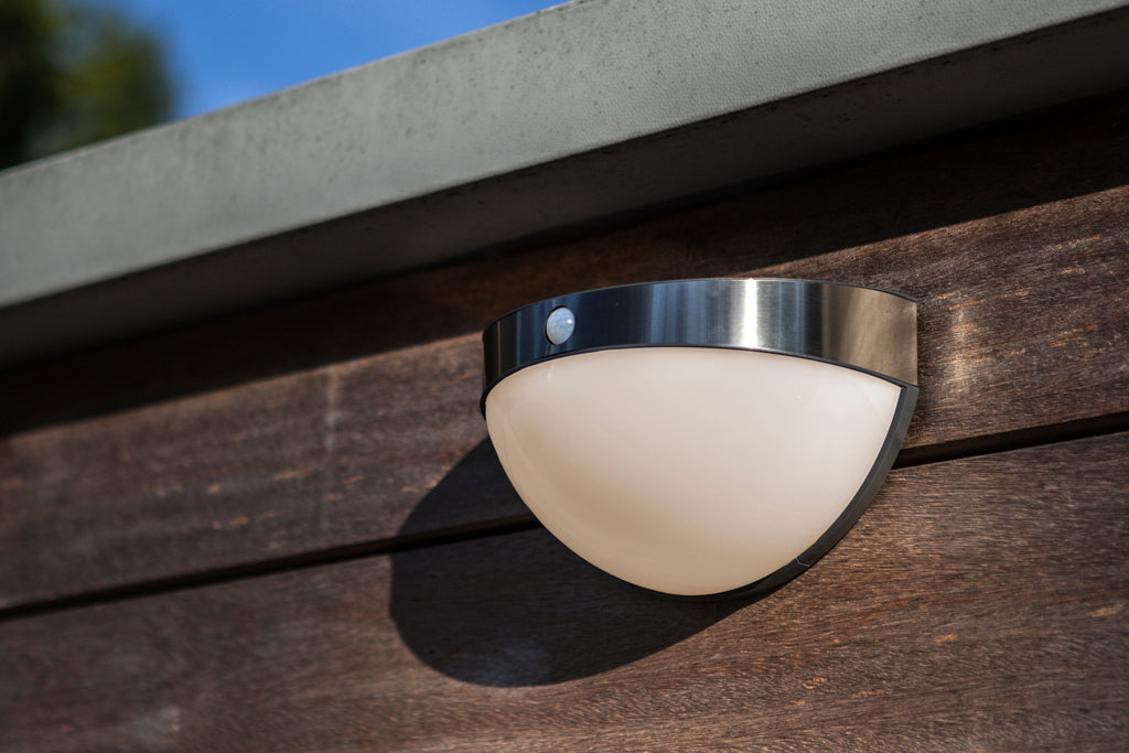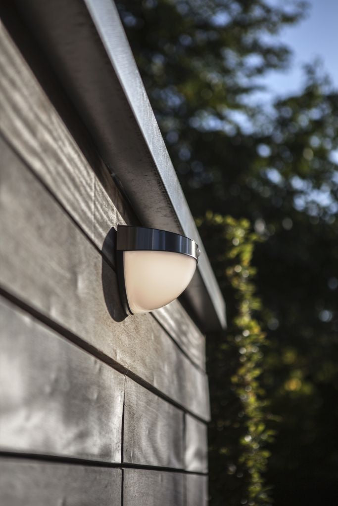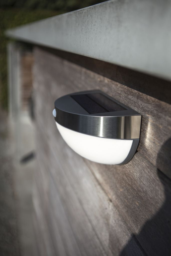 Half-globe solar light radiating a homogenous light. The PIR motion sensor is nicely incorporated in the stainless steel ring and will capture all movements and assures a powerful light any time somebody is passing throughout the night.