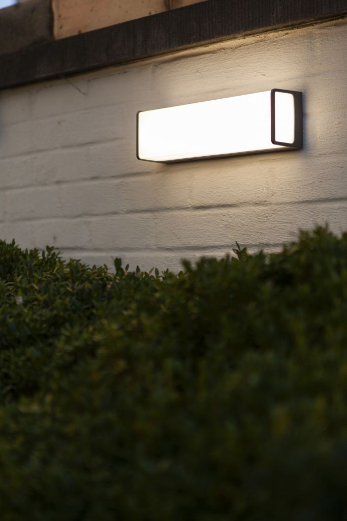 This LED wall light in antracite grey sits in a rectangular holder made of durable die cast aluminium. The elegant design radiates a powerful cool white light of 2200 lumen.