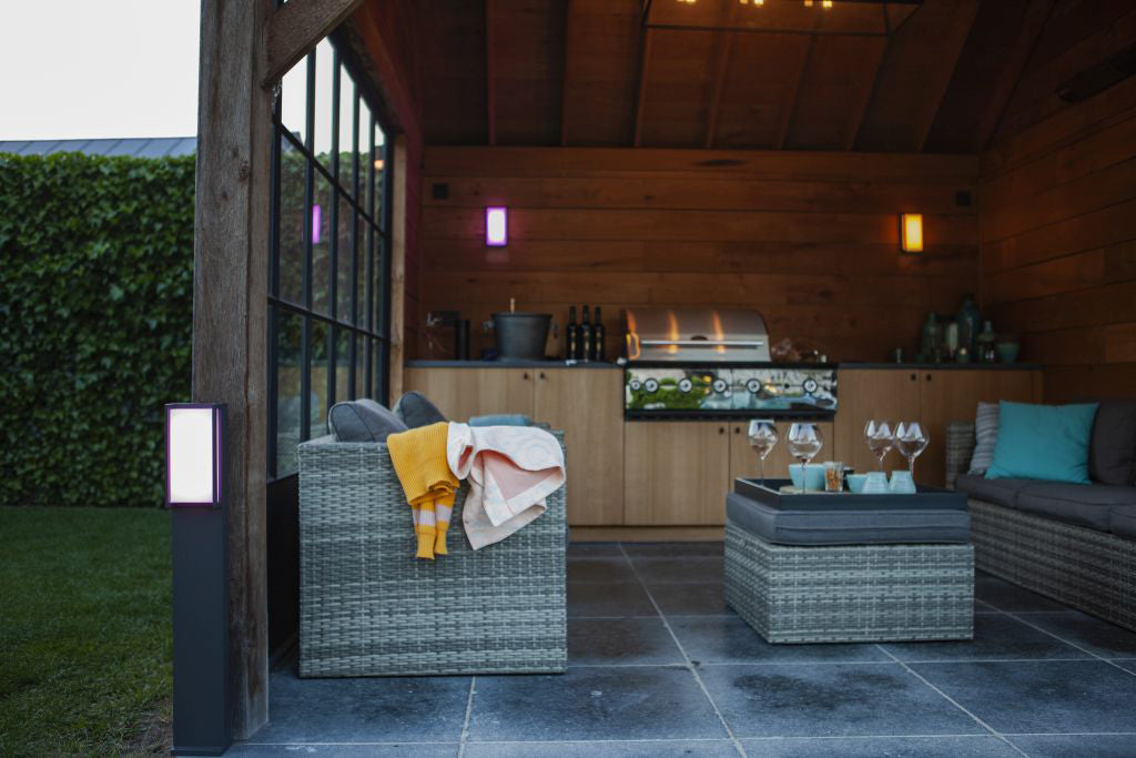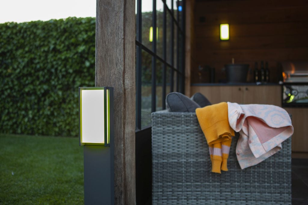 QUBO dark grey bollard diffuse a stunning homogenous connected light. Ideal for general lighting in your garden or terrace.