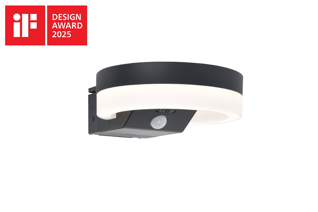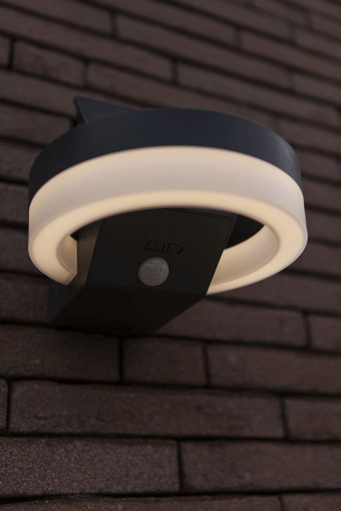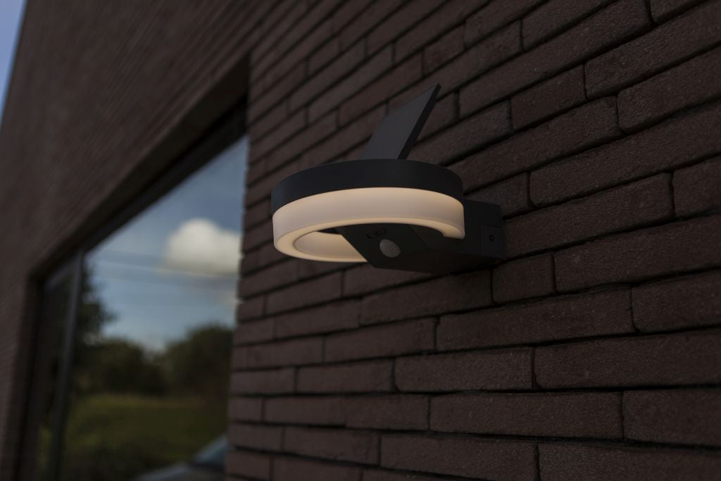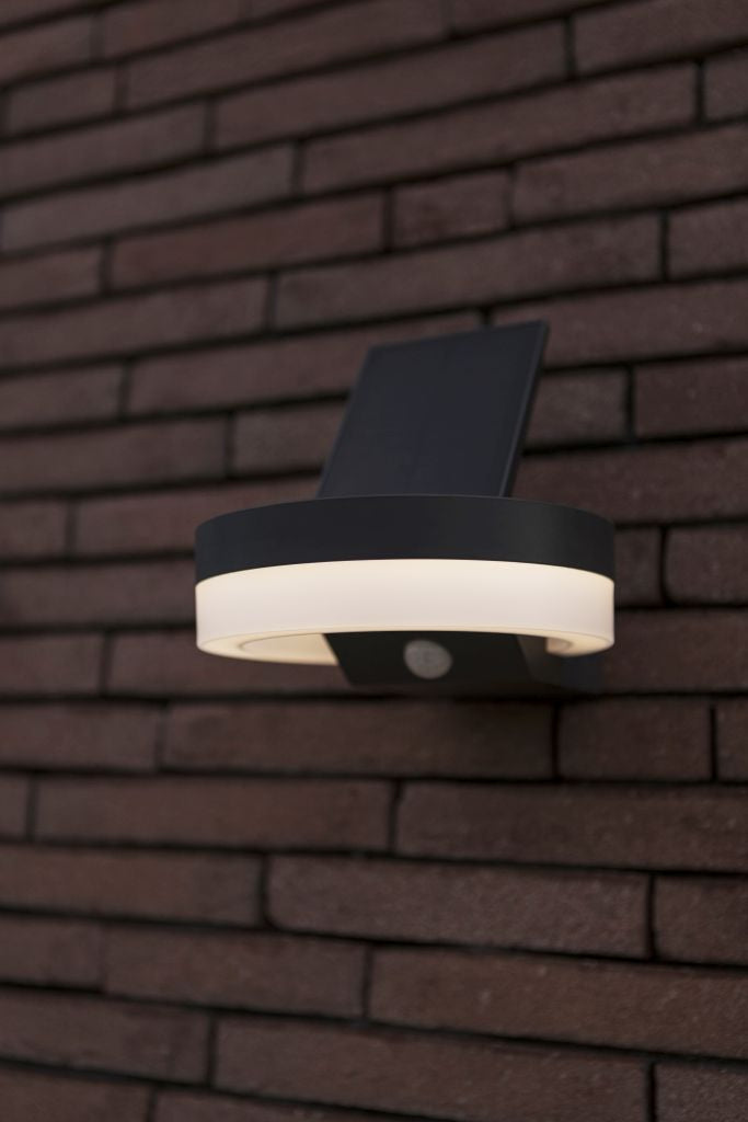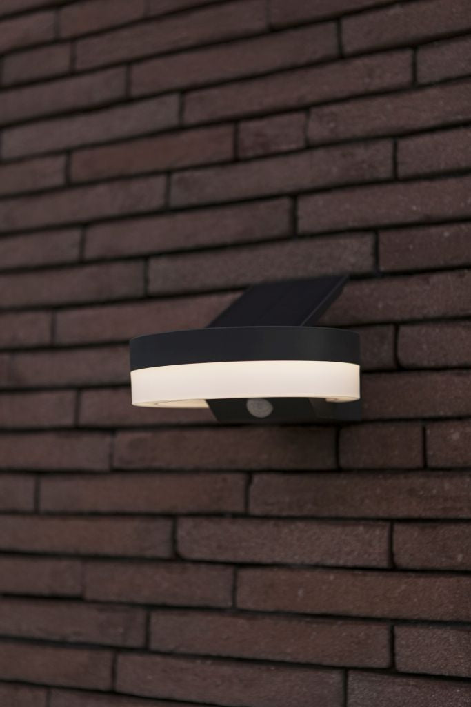 The RUNDA round solar LED wall light, available in dark grey, features an adjustable solar panel and a PIR sensor for enhanced functionality. This versatile design is also offered as a bollard, making it suitable for a variety of outdoor lighting needs.