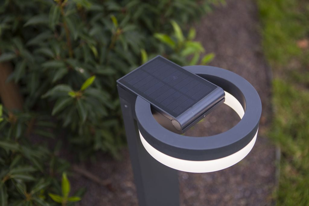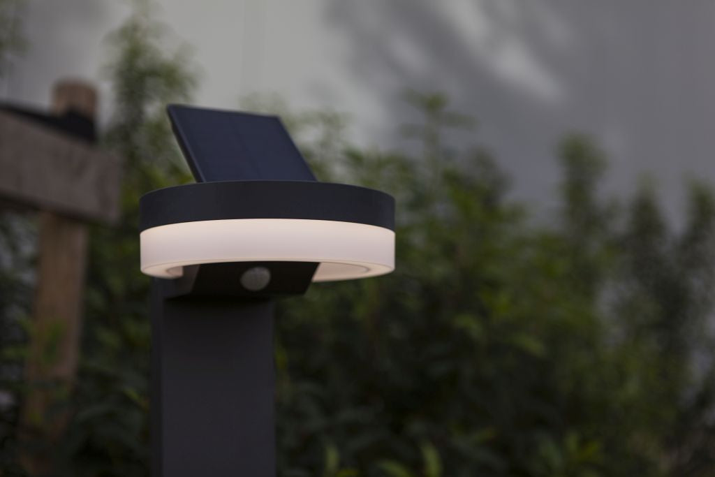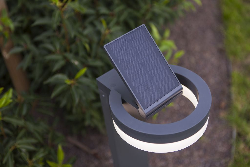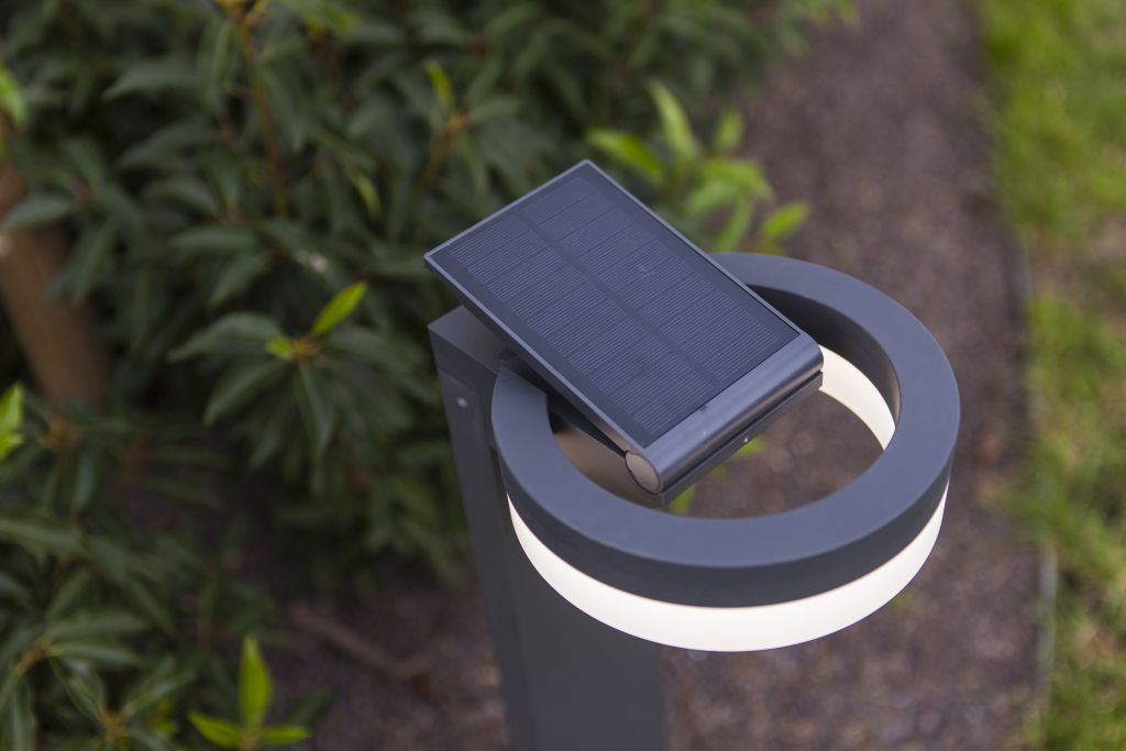 The RUNDA round solar LED wall light, available in dark grey, features an adjustable solar panel and a PIR sensor for enhanced functionality. This versatile design is also offered as a wall light, making it suitable for a variety of outdoor lighting needs.
