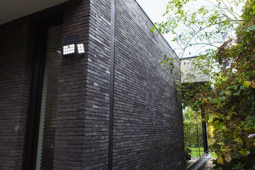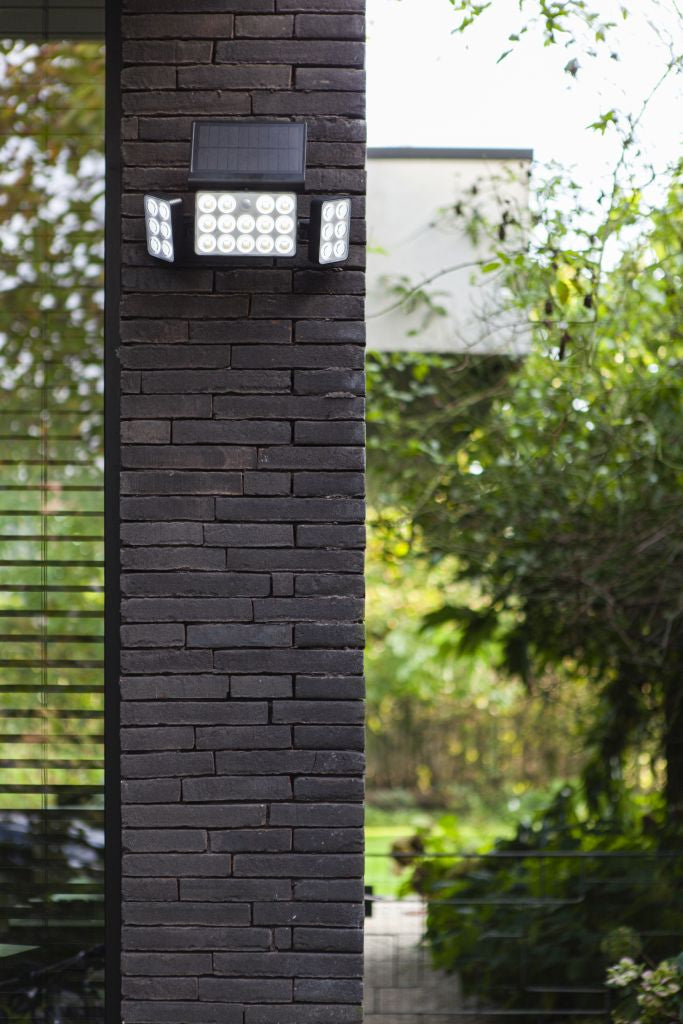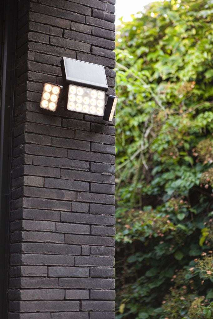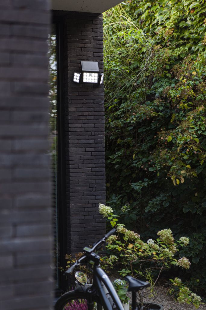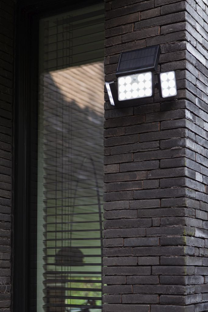 TUDA LED outdoor wall light with three adjustable heads is a highly efficient light source. It provides light 365 days a year because it is equipped with a highly efficient solar panel and a powerful rechargeable battery. This allows a completely powerless installation. The integrated sensor ensures that the light is automatically switched on when the PIR sensor detects an approaching person.