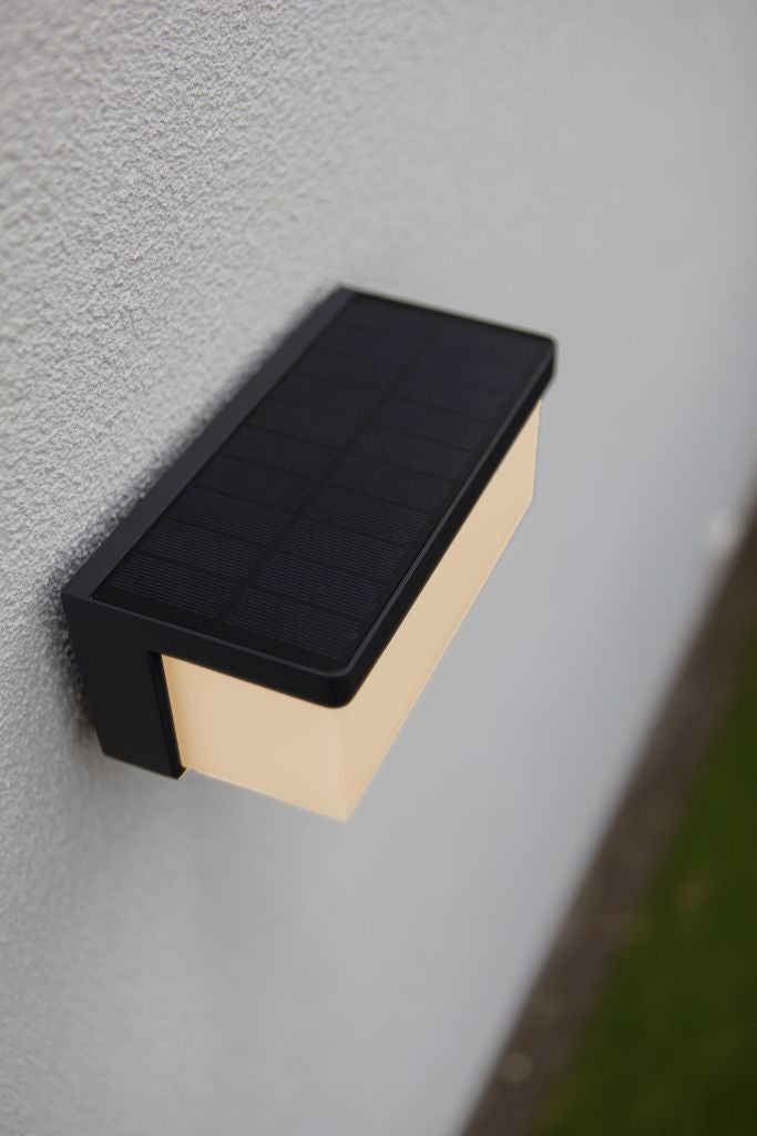 The ZELNA solar hybrid wall light, taking inspiration from the DOBLO design, offers a sustainable and stylish outdoor lighting solution in a sophisticated dark grey finish.